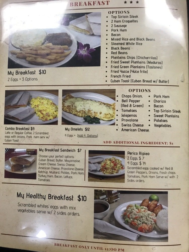 2 scrambles eggs with onions, pork ham serve with cuban toast(Bread with butter) and a choose or latte or regular coffee.